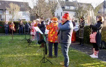 In der Seniorenwohnanlage der Antoniter Siedlungsgesellschaft hat es Mitte Februar Karneval in einer besonderen Form gegeben. Denn auch in dieser Karnevalssession werden Coronabedingt keine Sitzungen, Bälle und Parties in Säälen und Kneipen stattfinden. Das Feiern wird überwiegend nach draußen an die frische Luft verlagert – und so hat sich auch der Musikcorps „Rheingold“ Hürth-Efferen e.V. eine Alternative zu den abgesagten karnevalistischen Veranstaltungen überlegt. Die Musikerinnen und Musiker des Vereins besuchen soziale und karitative Einrichtungen wie Seniorenheime oder psychiatrische Kliniken usw. rund um Hürth-Efferen, um die dortigen Bewohnerinnen und Bewohnern mit einer musikalischen Darbietung in Karnevalsstimmung zu versetzen.